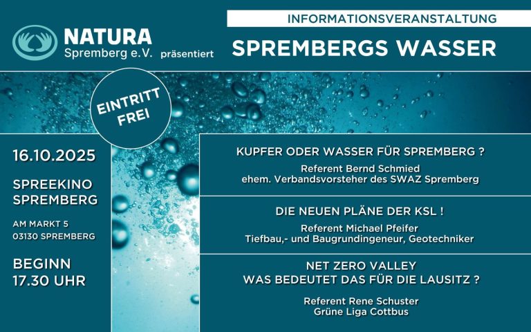 NATURA Spremberg e. V. lädt zur Themen-reihe Sprembergs Wasser ein. Kurze, spannende Vorträge, praktische Tipps und moderierte Diskussionen mit lokalen Expertinnen und Experten. Netzwwerk und Austausch inklusive. Seid dabei und entdeckt Sprembergs Wasservielfalt.